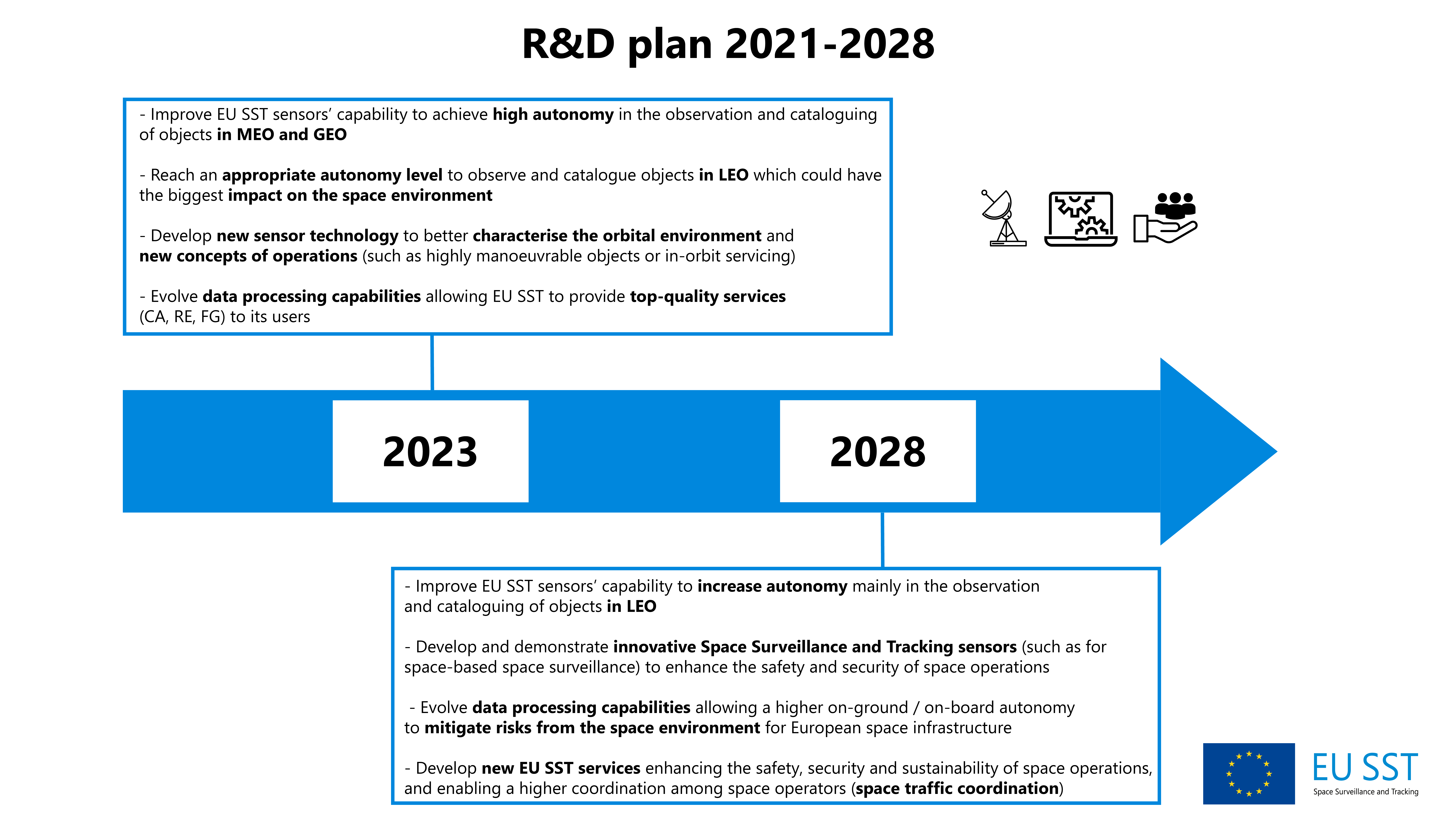 To facilitate a sustained long-term evolution and enhancement of EU SST, the SST Cooperation put in place a Research and Development (R&D) plan consisting of a set of hardware and software R&D activities. The selection of the subjects to develop and the outcomes to be taken to a pre-operational stage is done through architecture studies and system design activities. This process allows EU SST to assess and select the activities presenting the highest quality and added value and to offer cost-efficient space surveillance and tracking services, while anticipating needs and preparing for the future.